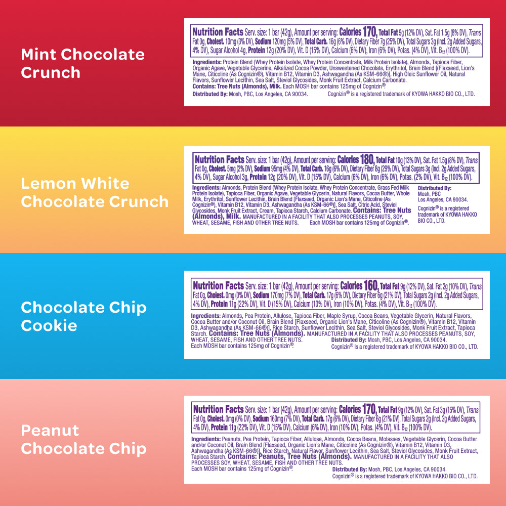 - Mint Chocolate Crunch: Protein Blend (Whey Protein Isolate, Whey Protein Concentrate, Milk Protein Isolate), Almonds, Tapioca Fiber, Organic Agave, Vegetable Glycerine, Alkalized Cocoa Powder, Unsweetened Chocolate, Erythritol, Brain Blend [Flaxseed, Lion's Mane, Citicoline (As Cognizin®), Vitamin B12, Vitamin D3, Ashwagandha (As Ksm-66®)], High Oleic Sunflower Oil, Natural Flavors, Sunflower Lecithin, Sea Salt, Steviol Glycosides, Monk Fruit Extract, Calcium Carbonate. Contains: Tree Nuts (Almonds), Milk.